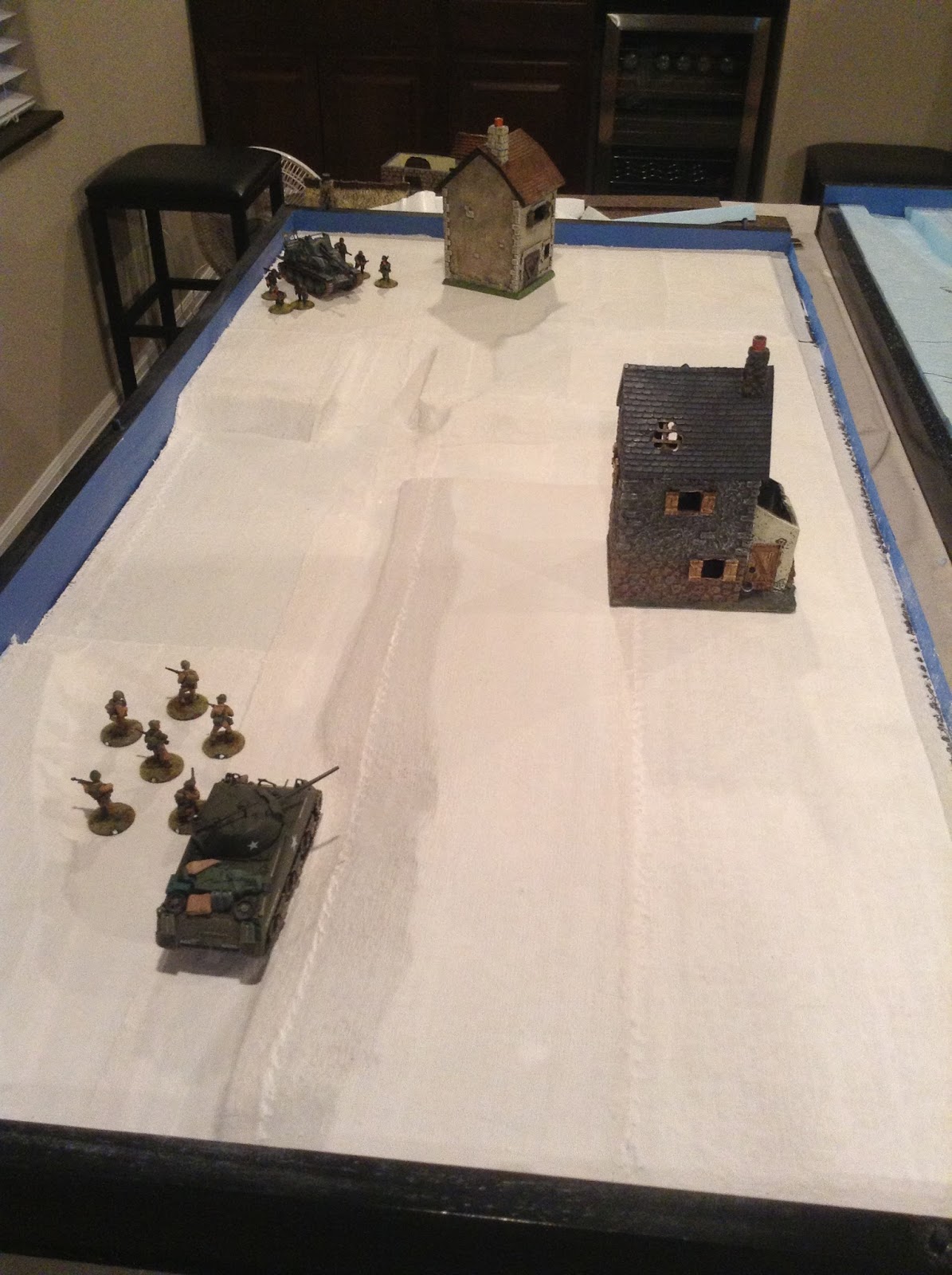 The Building on the hill in the foreground was scratch built by Mr. Tony Fryer. The interior even has wall paper and wood floors. On this hill we are going to put the Ruined Farm that comes in the Bolt Action Normandie Starter Box.
