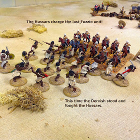 Just at that moment, Lt. Wilberforce's Hussars appeared, in the rear of the enemy's force! After taking a moment to size up the situation, the Hussars formed up stirrup-to-stirrup and charged the nearest dervish, who at that moment were closing in on the front of the Fuzileers.